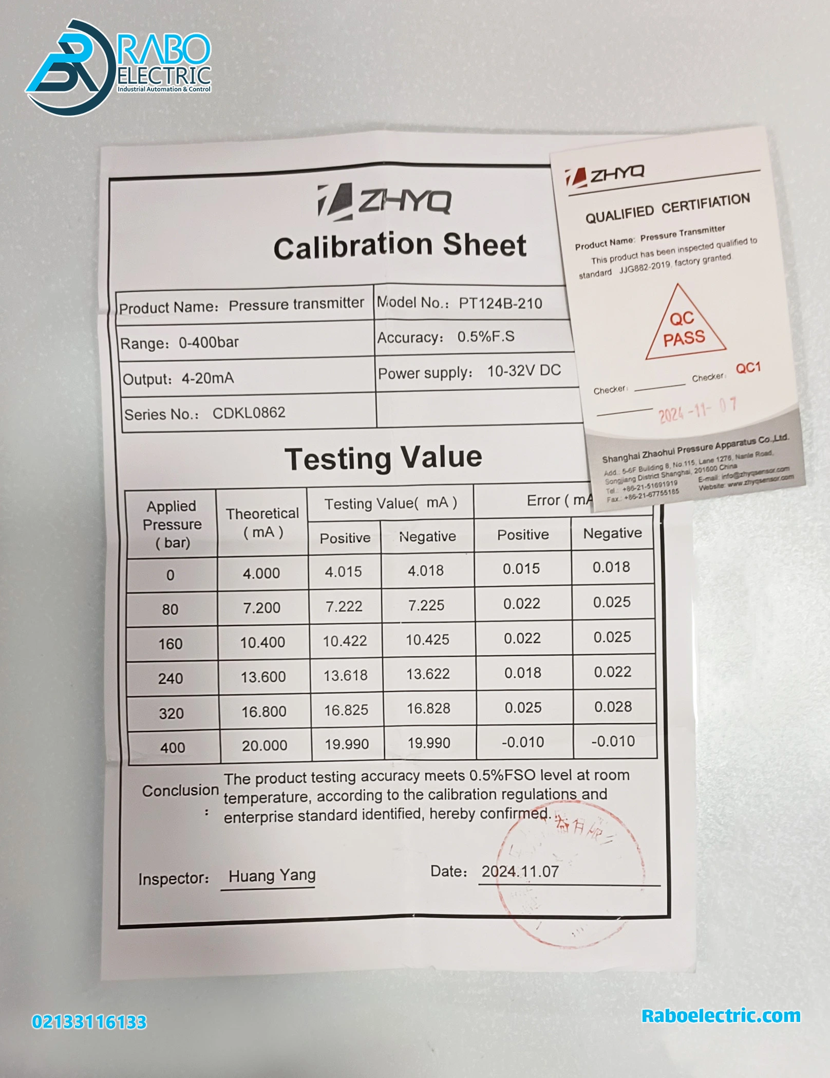 ZHYQ هر ترانسمیتر فشار را با یک برگه کالیبراسیون اختصاصی ارائه میدهد که شماره سریال و تاریخ تست محصول روی آن درج شده است. اطلاعات برگه کالیبراسیون مطابق اطلاعات سنسور و اطلاعات روی جعبه محصول است. قیمت مناسب در کنار کیفیت بالا، PT124B-210 را به یک انتخاب اقتصادی و مطمئن برای طیف وسیعی از کاربردهای صنعتی تبدیل میکند.