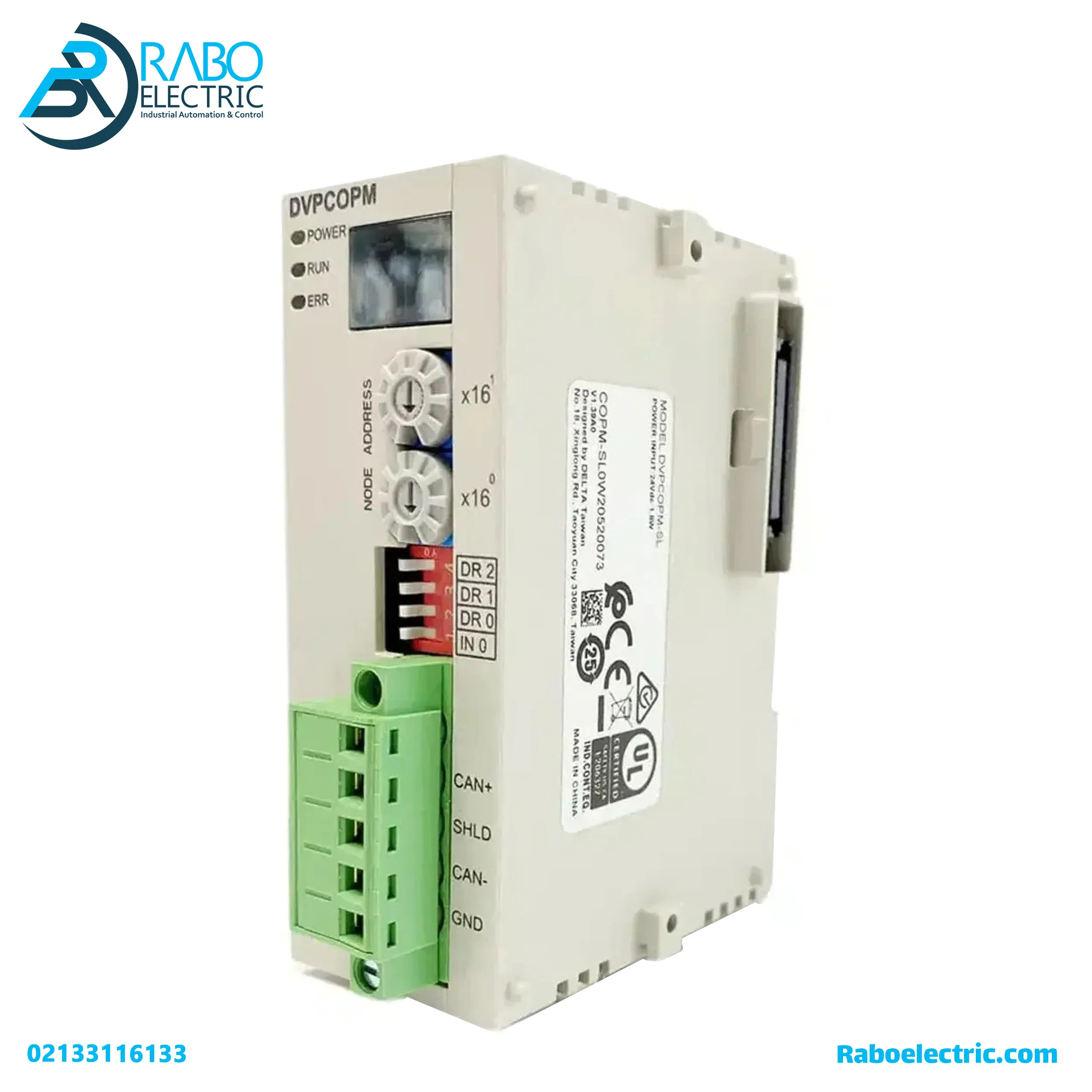 ماژول شبکه CANopen دلتا DVPCOPM-SL یک کارت شبکه برای برقراری ارتباط بین کنترلرهای سری DVP و تجهیزات صنعتی در بستر شبکه CANopen است. این ماژول از سمت چپ به PLC متصل میشود و نیازی به فضای زیاد در تابلوهای کنترل ندارد. شما میتوانید سرعت انتقال داده را با استفاده از دیپسویچ تنظیم کرده و تا سرعت 1 Mbps افزایش دهید. این کارت شبکه قابلیت پشتیبانی از 127 ایستگاه را دارد و ارتباطی پایدار بین کنترلر، سرو موتور و درایو ایجاد میکند. همچنین پروتکل شبکه این مدل PDO Cycle است.