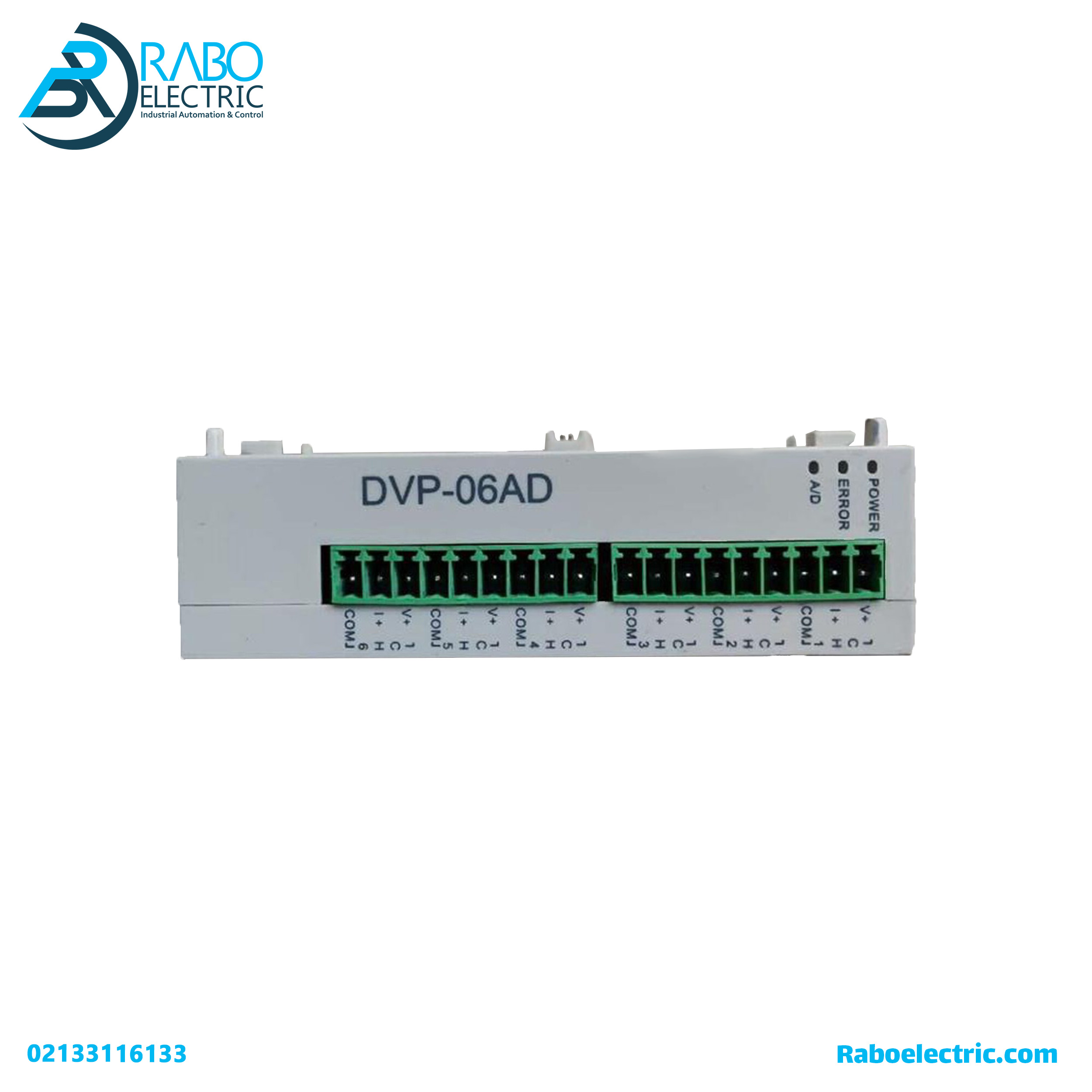 ماژول توسعه ورودی آنالوگ دلتا DVP06AD-S یک کارت تبدیل است که ورودی آنالوگ را به دیجیتال تبدیل کرده و سپس به plc ارسال می کند. این ماژول از سمت راست به CPU متصل میشود. مولفههای اصلی این محصول شامل 6 کانال که در ورودی آنالوگ جریان با دقت 13 بیت و در ورودی آنالوگ ولتاژ با دقت 14 بیت است. این محصول با پورت RS484 مودباس ASCII/RTU به PLC متصل میشود.